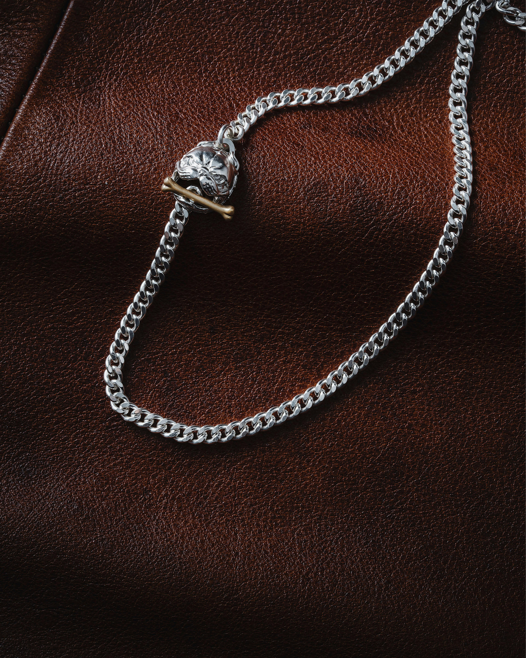 "Presentamos una cadena única con un distintivo cierre de broche de barra en forma de hueso, que se inserta hábilmente a través de un dije detallado con la cabeza de un bulldog. Fabricada con una cadena de eslabones de alta calidad y acabados metálicos plata esterlina para la cadena y la cabeza del bulldog, y baño de oro para el hueso, esta pieza es una declaración de estilo audaz y original.