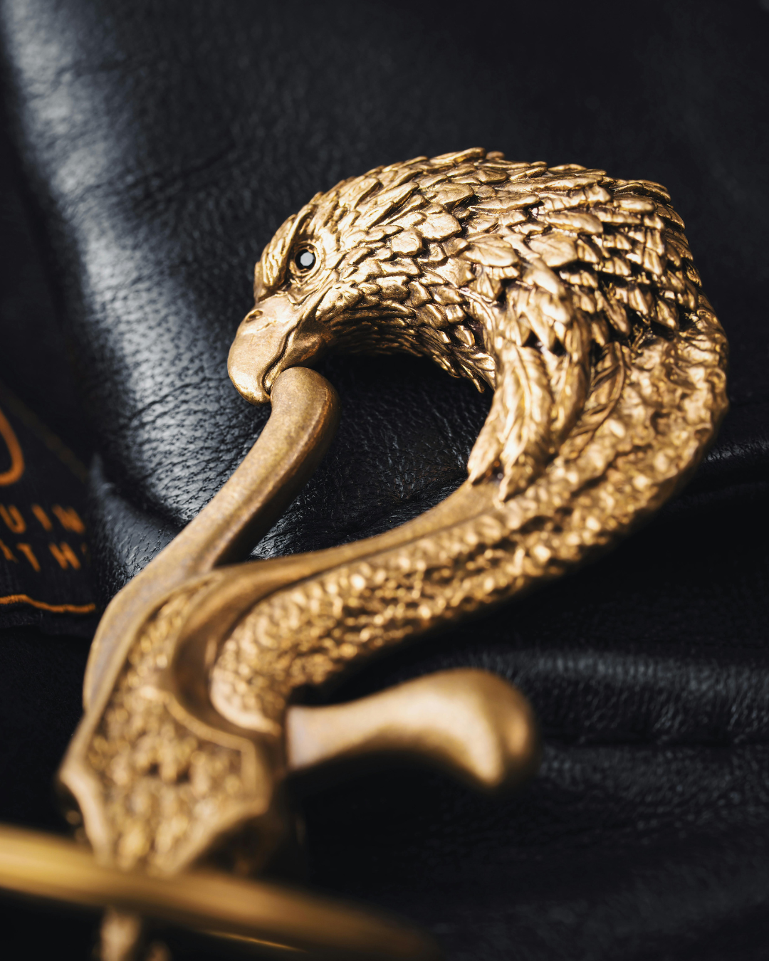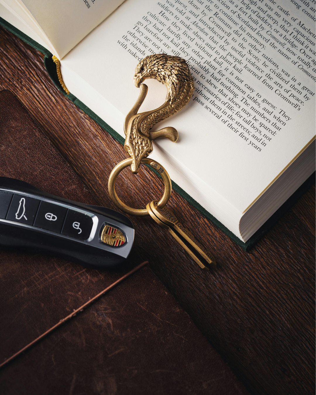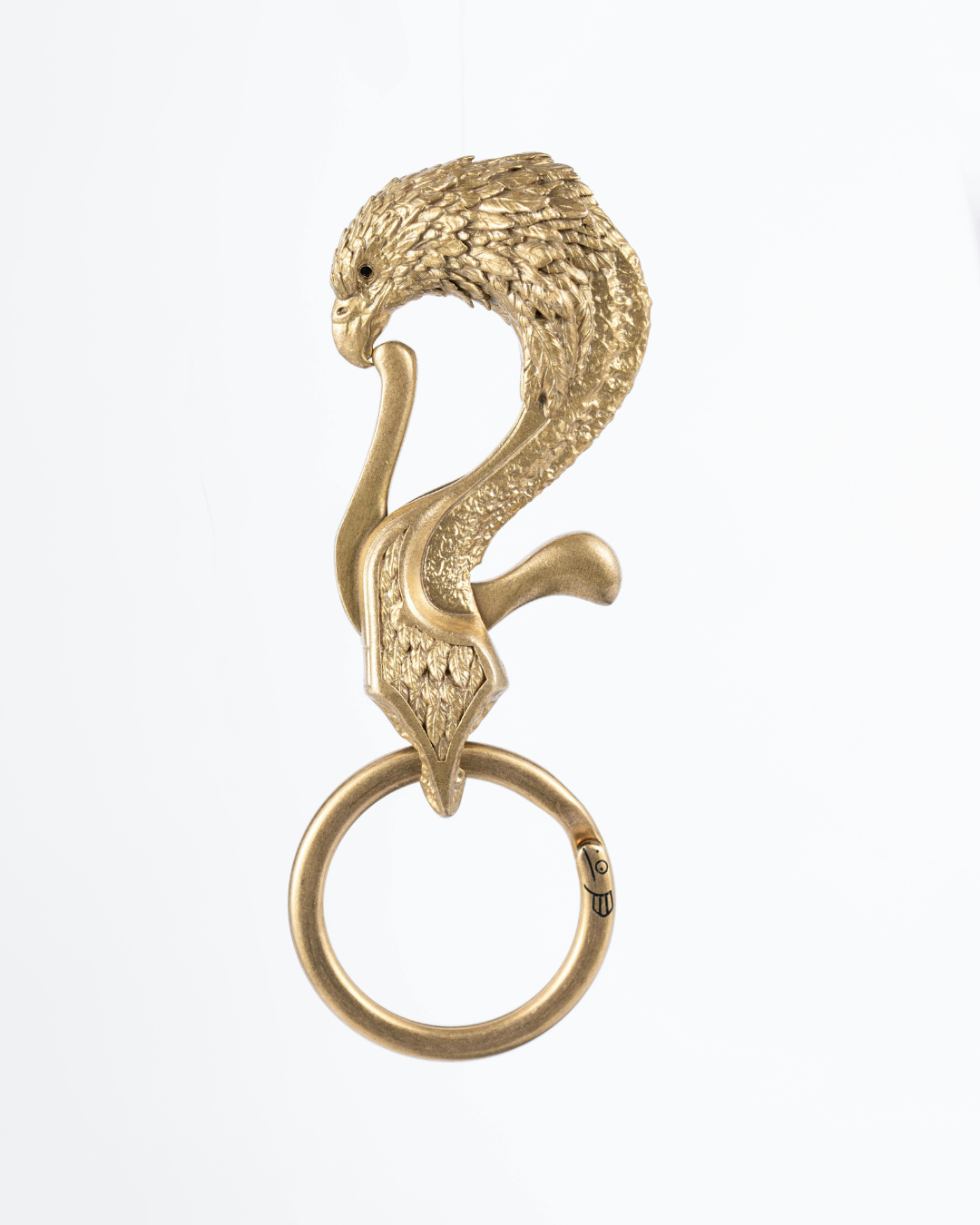 "Llavero de lujo chapado en oro, diseñado con una impresionante figura de un grifo (o ave mítica). Su acabado brillante y los detalles minuciosos del diseño, desde las plumas esculpidas hasta el pico robusto, lo convierten en una pieza de arte funcional. No solo mantendrá tus llaves organizadas, sino que añadirá un toque de opulencia y carácter a tu día a día."